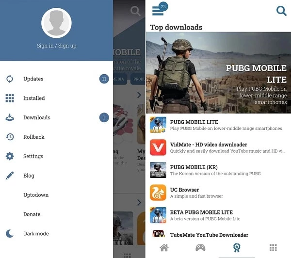 UptoDown è la soluzione migliore per scaricare file APK di diverse app. Non è necessario entrare nei dettagli sulla verifica dell'app o sull'approvazione da parte dell'app ufficiale. Basta aprirla, senza bisogno di effettuare l'accesso, accedere alla categoria desiderata, selezionare il file APK e iniziare il download.